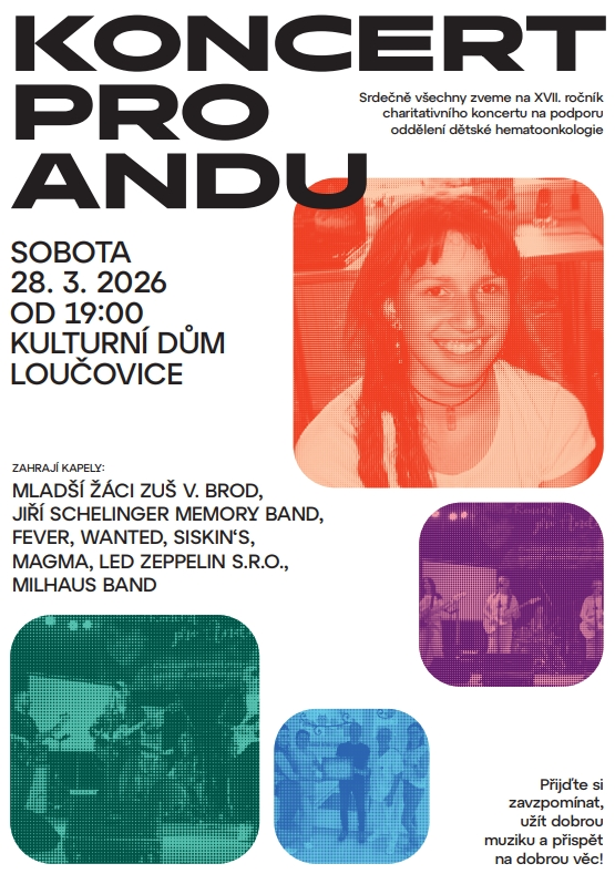 Po roce opět zavzpomínáme na kamarádku Andu. Všichni jste zváni na XVII. ročník charitativního koncertu do kulturního domu V Loučovicích 28.3.2026 v 19 hodin. Čeká nás hezký zážitek s milou vzpomínkou.